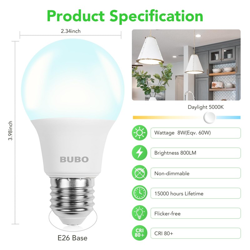 - Eye-Friendly, Non-flicker Lighting:Engineered for eye comfort, BUBO A19 60W LED light bulbs provide steady, non-flickering, and buzz-free illumination. Ideal for reading, studying, or working, they help reduce eye strain and enhance your everyday comfort.