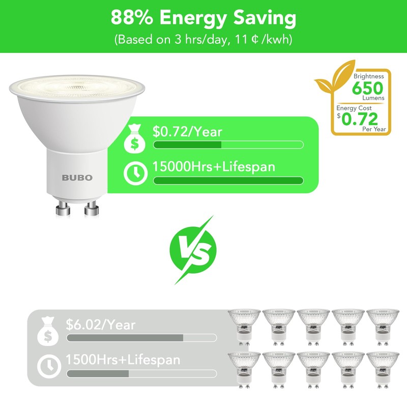 • 【Energy & Long Lifespan】DEGNJU 6W GU10 Bulb replaces 50W halogen and incandescent bulbs, saving over 88% on the electricity bill of lighting. Each GU10 LED light bulb costs only $0.72 per year to operate (based on 3 hours/day, 11¢/KWH). Low power consumption provides over 15000 hours of lifespan, reducing bulb replacement frequency.