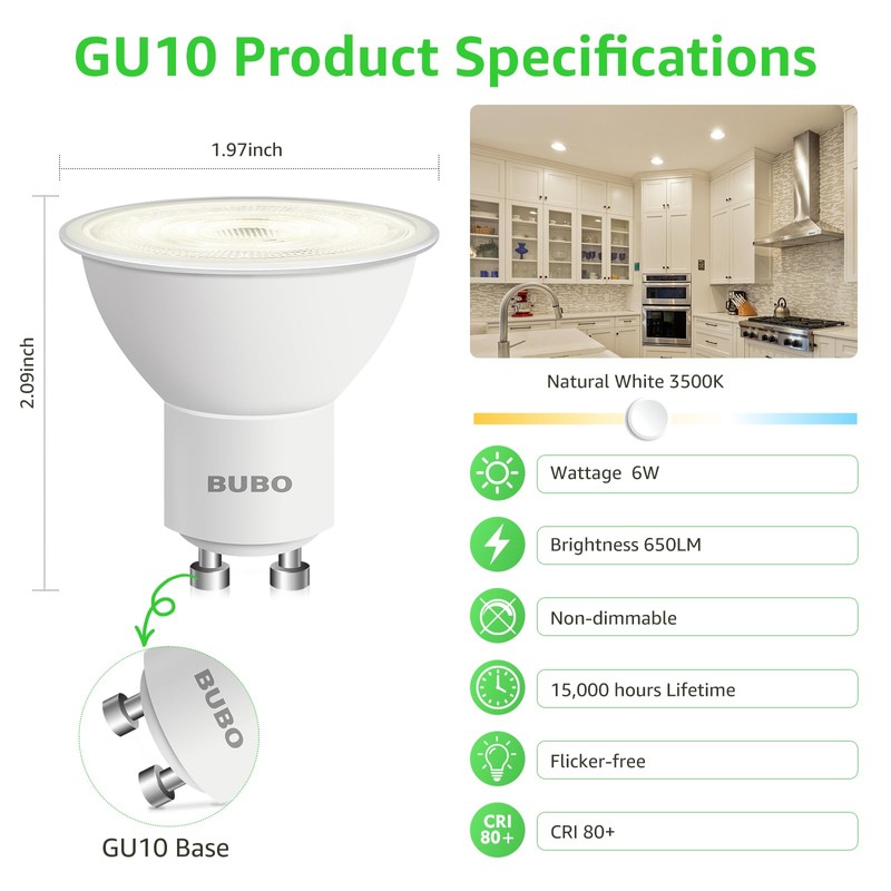 BUBO GU10 LED Bulb 6W Equivalent 50W, 3500K Natural White 650 Lumens, Non-Dimmable GU10 Bulb Replacement for Track Lighting, MR16 LED Bulb for Kitchen, Range Hood, Living Room, Bedroom, 10 Pack