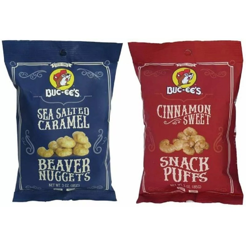 - Buc-ees Snack Combo: Cinnamon Sweet Snack Puffs and Sea Salted Caramel Beaver Nuggets, Gluten Free, One 3 Ounce Bag of Each (6 Ounces Total)