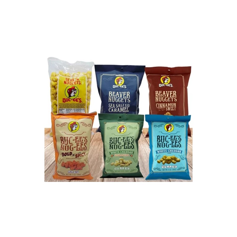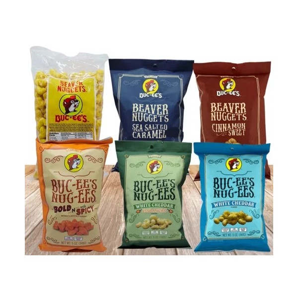 - 6 bags total: One of each of Buc-ee's Nuggets and Nug-ee flavors (Original, Cinnamon Sweet, Sea Salted Caramel, White Cheddar, White Cheddar Habanero, and Bold-N-Sorta Spicy)