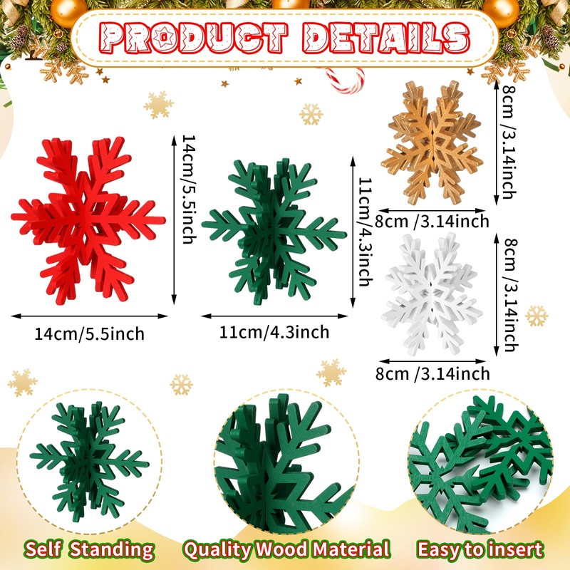 Bucherry 12 Pcs Wooden Snowflake Table Decor 3D Snowflake Tabletop Signs and Centerpiece for Christmas Xmas Winter Wonderland Decorations Home Party (White, Gold, Red,Green)