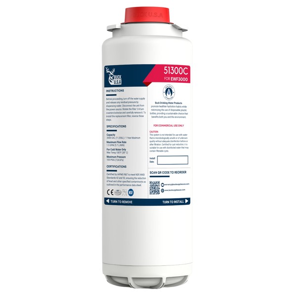 Buck 51300C WaterSentry Replacement Filter for EWF3000 - Compatible with Elkay ezH2O Bottle Filling Stations, NSF/ANSI Certified, Removes Lead & Microplastics, 3000 Gallons/12 Months, No Chip - 1 Pack