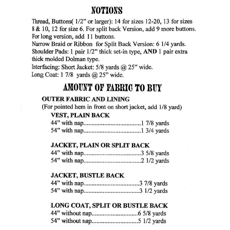 Ladies' Outing Jacket Package includes sizes 6-20 Buckaroo Bobbins sewing pattern for authentic vintage Western clothing. Pattern condition: uncut, factory folded and complete with instructions. Buckaroo Bobbins patterns are printed on paper for more durability and ease of use. **Note: The front says it includes sizes 8-20, but I checked the patterns and they DO include 6-20. A perfect match with skirt patterns or your favorite pair of jeans, it features a convertible collar; stand up - for a high neck or open - for a traditional lapel, figure flattering seaming, optional shaped hem and bustle or split back, and leg-o-mutton sleeves typical of the late 19th century. In the 1880's dark, rich colors (mahogany, rust, dark blue) were favored, giving way to the more jewel tones (bordering on garish) in the later years (purples, bottle greens, royal blue, ruby, and magenta). Black was always considered correct. | |
