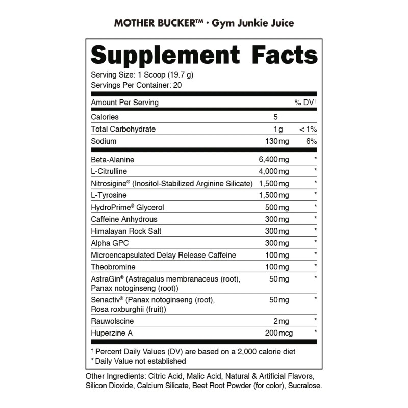 Mother Bucker Pre-Workout fue diseñado específicamente para adictos a los estimulantes de élite, atletas avanzados y entusiastas del fitness experimentados. Toma Mother Bucker para revivir esa sensación de pre-entrenamiento por primera vez: prepárate para conquistar.