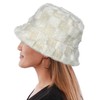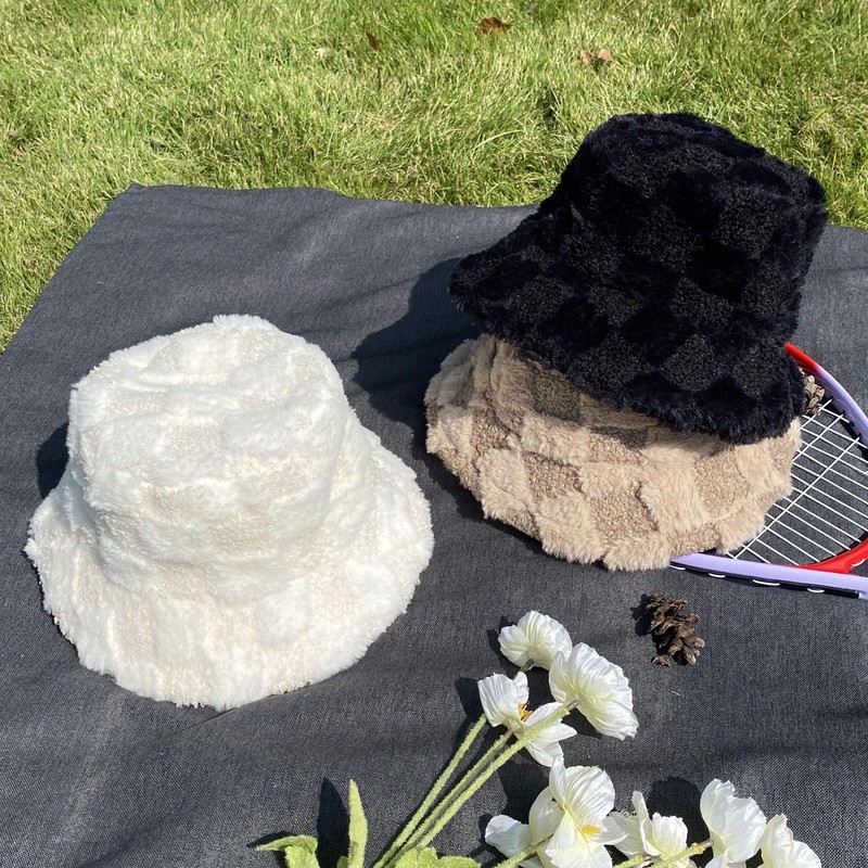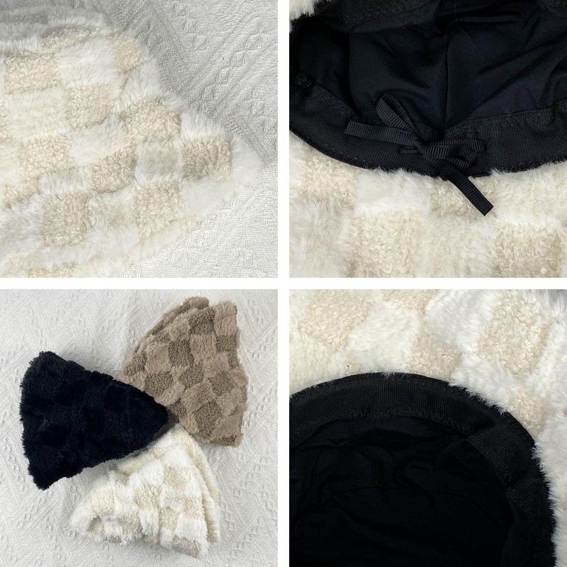 Bucket Hats Fuzzy Sheep Print Women Men Plush Cap Warm Soft Fisherman Hat Adjustable Winter Spring (Checkered Beige)