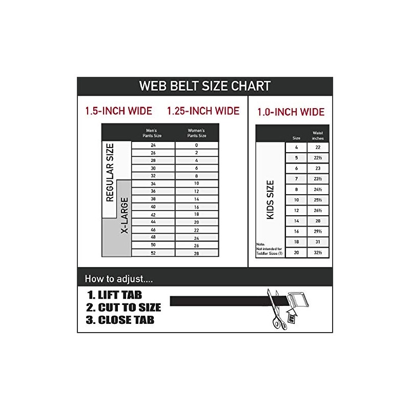 - This belt is 1.5" wide, and sized for adults, fitting up to a 42 pant size. This web belt is made from high-density polyester and steel.