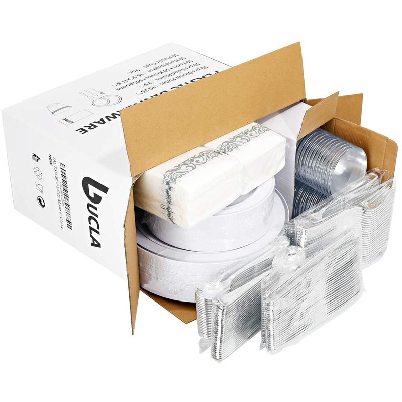 BUCLA 350PCS Silver Plastic Plates With Disposable Plastic Silverware&Napkins...