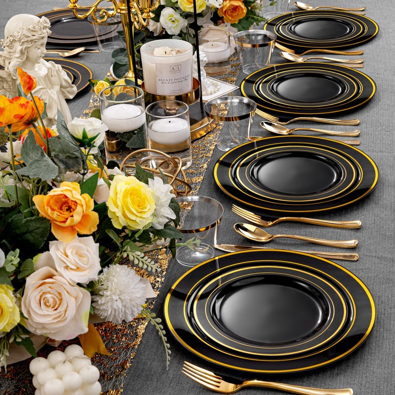 - VERSATILE: Due to its disposable nature,black disposable dinnerware set is suitable for most occasions,such as weddings,birthday parties,picnics,etc. Of course,black and gold plastic plates are also very suitable for daily use,especially for people who like convenience