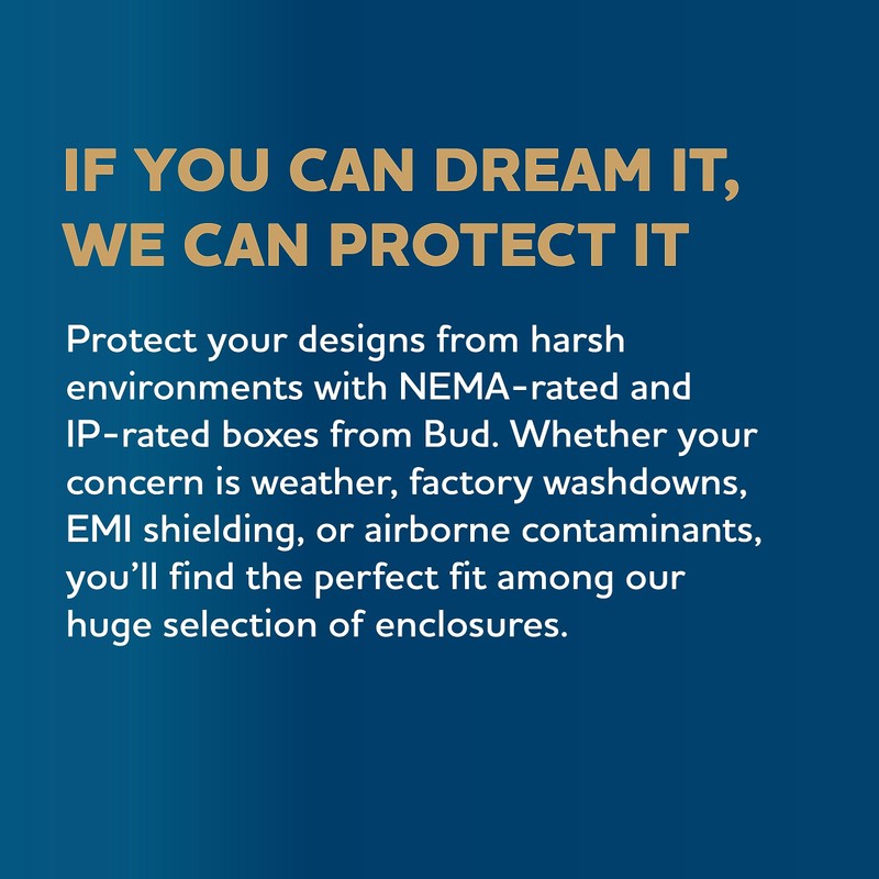 - BUD INDUSTRIES: Bud has an extensive line of affordable products ranges from small metal and plastic electronics enclosures to large cabinet racks. Many of our enclosures meet IP 67/NEMA requirements.