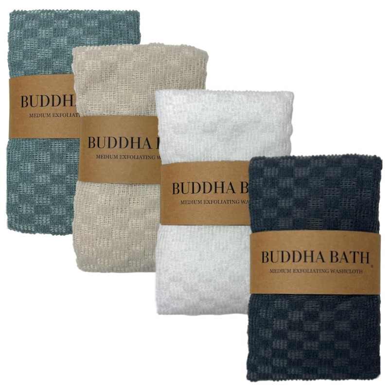 Buddha Bath Extra Long Exfoliating Shower Towel Washcloth (Medium Exfoliate) - Dark Gray, Bone, Silver Blue, White - (4 Mix Count)