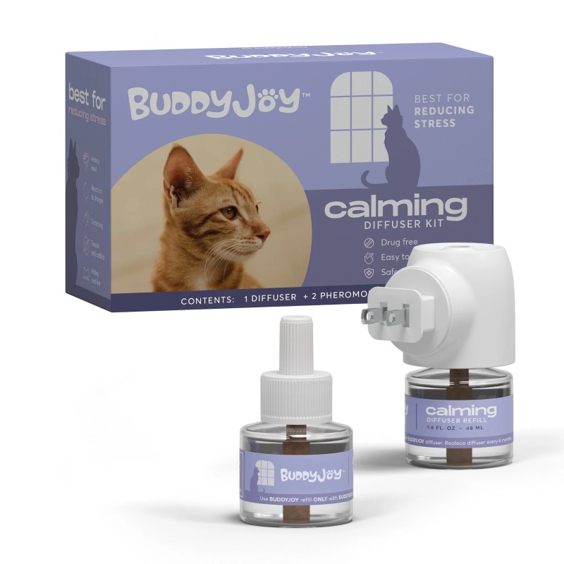 - EFFECTIVE CAT CALMING SOLUTION These BuddyJoy Cat Calming Diffuser Refills create a soothing environment for anxious or stressed cats. Formulated with calming pheromones, each refill helps reduce stress, ease anxiety, and promote relaxation. Ideal for cats dealing with separation anxiety, loud noises, travel, or changes at home—ensuring your feline feels safe and calm throughout the day.