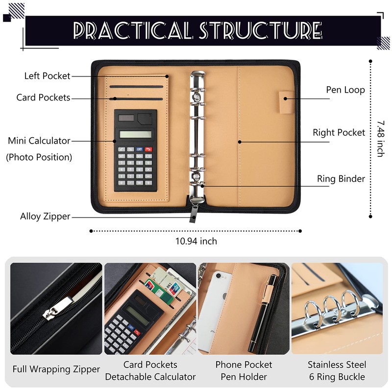 - 【MULTIFUNCTIONAL A6 BINDER WITH ZIPPER】Cash stuffing envelopes binder are Made from premium and durable PU leather. Several pockets to keep your bank cards, ID card, cash, receipts, invoice and passport. Mini detachable caculator can help to caculate income and expenses anytime anywhere. What's more, All wrapped zipper design can close the wallet tightly, prevent items from falling off.