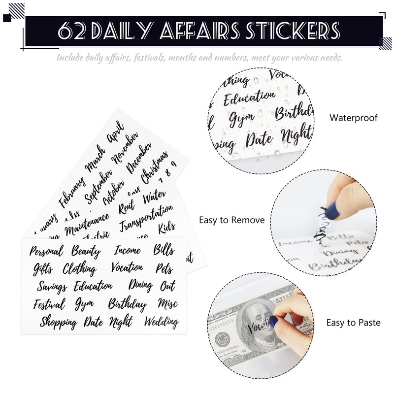 - 【62PCS CATEGORY STICKERS & 12PCS CASH ENVELOPES】The cash envelopes for budgeting are made from soft and double-sided translucent PVC. With sealed smooth zipper to protect inner items from water and dust. You can easily classify and manage your money according to different expenditure with 62pcs daily affairs stickers. Let's start to improve unplanned consumption habit, keep budget organized!