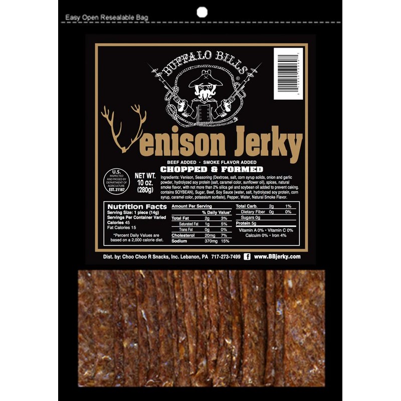 10oz of our Buffalo Bills Venison Jerky in 7” strips. One of the best commercial brands of venison jerky on the market, this chopped and formed jerky is made with 97% farm-raised venison and 3% beef. (Beef is added to this product in order to comply with USDA regulations to allow for nationwide distribution.) Each 10oz vacuum packed bag of Buffalo Bills Venison Jerky contains 20 unwrapped 7" venison jerky strips and each strip weighs 0.5oz.