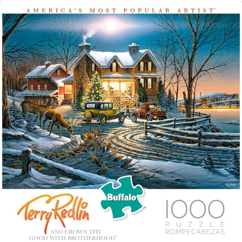 And Crown Thy Good With Brotherhood is a 1000-piece jigsaw puzzle by famed painter Terry Redlin. As twilight falls upon a winter day the deer come to the driveways edge to see what is happening. Friends show up with Christmas gifts and pass them to friends to carry into the house. A tree is decorated with colorful lights of blue, yellow, orange and red as the city in the background glows softly off the snow. U.S. ART magazine dubbed Terry Redlin “America’s Most Popular Artist” every year from 1991 to 1998 and inducted him into their Hall of Fame in 1992 for his use of earthy colors, blazing sunrises and sunsets, and nostalgic themes. Today, over 2 million of Terry’s tranquil, heartwarming art prints grace the homes of his collectors—making him “America’s Favorite Artist.” Every Buffalo Games jigsaw puzzle is manufactured using premium quality 100% recycled paperboard. A precision cutting technique guarantees that every piece will fit soundly with the company's signature Perfect Snap™. A bonus puzzle poster is also included so that you have a handy reference of what the completed puzzle should look like while you put yours together.