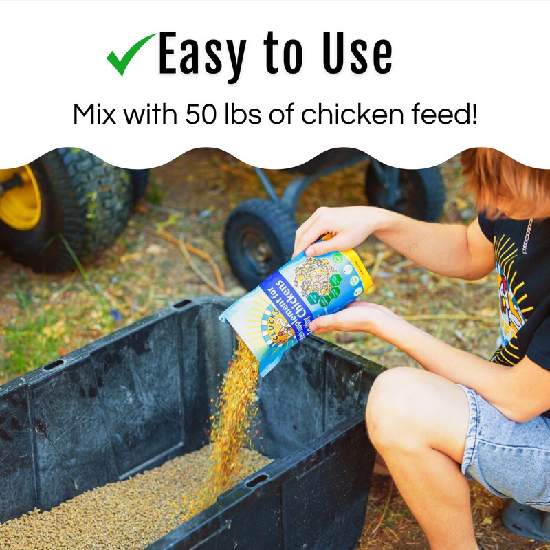 - Easy to use: Simply add one bag of BuffClucks to a 30-50 pound bag of poultry feed, mix, and serve! Our all-natural treat supports immunity and respiratory health, kicks mites, lice, and worms to the curb, improves feather and egg quality, and helps with digestion.