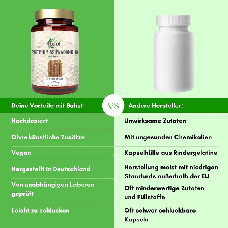 - Natural and vegan: our Ashwaganda capsules are 100% vegan, free from genetic engineering, flavours, sugar and dyes. Experience pure nature - without compromise.