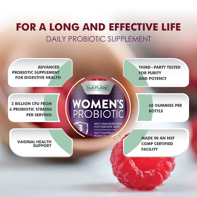 Built by Nature Built by Nature Probiotics for Women Gummies 3 Billion CFU, 6 Probiotic Strains with Cranberry Supplement, Digestive, Immune, Vaginal & Urinary Health, Shelf Stable, 60 Gummy
