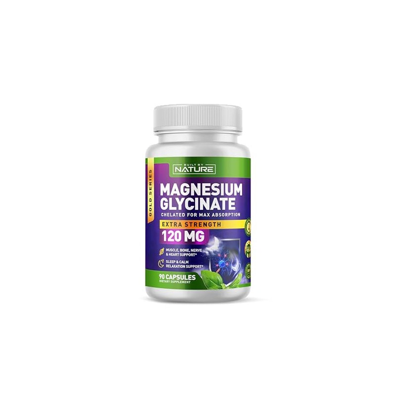 Built By Nature Magnesium Glycinate - Chelated for High Absorption – Supplement to Support Sleep, Muscle, Heart & Nerve Health - 120 mg Magnesium per Serving/Capsule - 90 Capsules