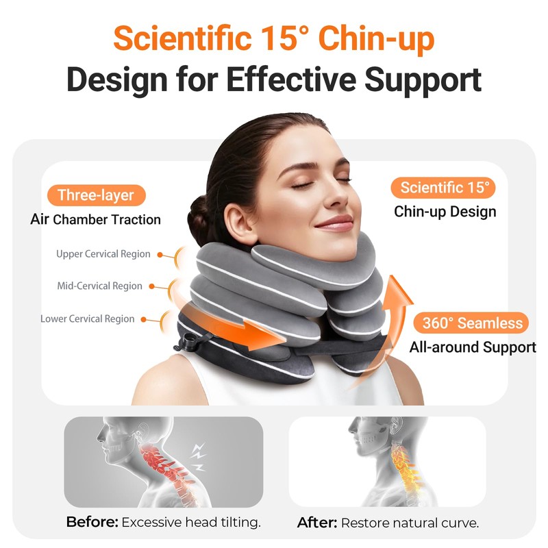 Built-in Inflatable Neck Stretcher, Cervical Traction Device with High-Front & Low-Back for Effective Traction and Support, Neck Decompression Devices with 3-Layer Chambers in Varied Sizes, Home Use