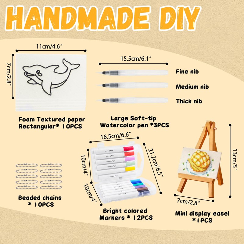 - 【PACKAGE INCLUDE】Includes everything you need:10 foam structure plates, 12 colorful markers, 3 blank soft tip watercolor pens and 10 bead chains to display your masterpiece. Easily pack the compact set in your bag for road trips, art classes or quiet afternoons at home.