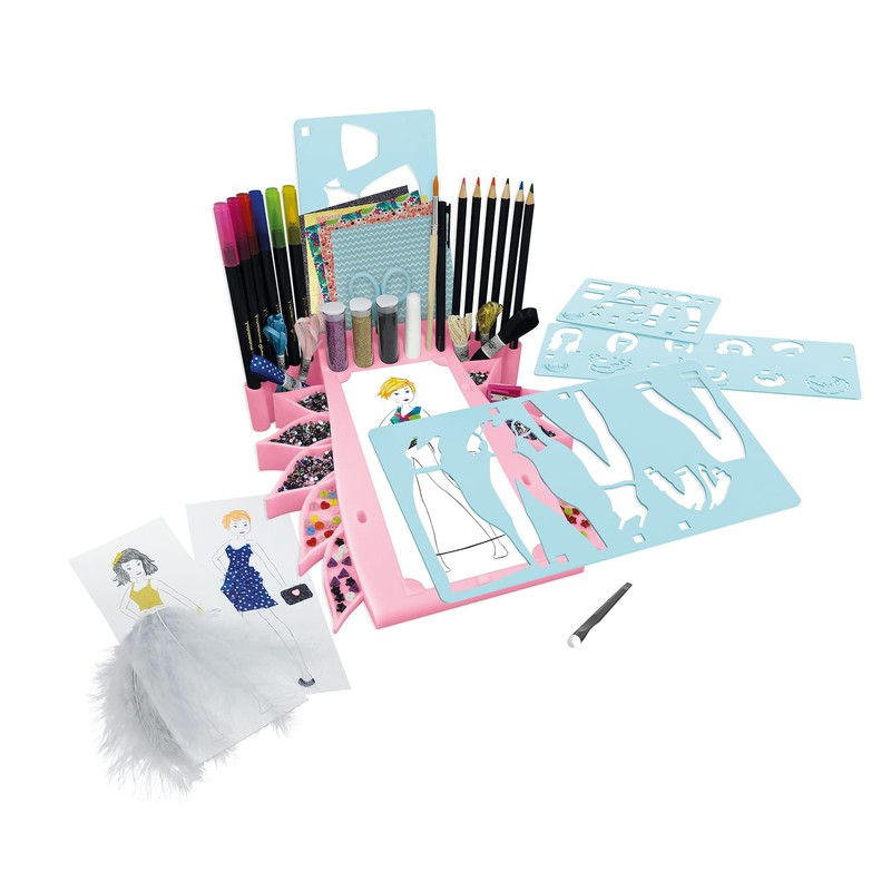 BUKI France 5408 Professional Studio Mode Fashion Designer Kit. Create & Design Outfits. Includes Self-adhesive Fabric, Feathers, Glitter, Felt, Ribbons, Felt-tips, Pencils, Scissors. Suitable for 7+