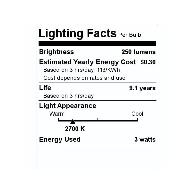 - 25 Watt equivalent, using only 3 Watts (250 lumens).