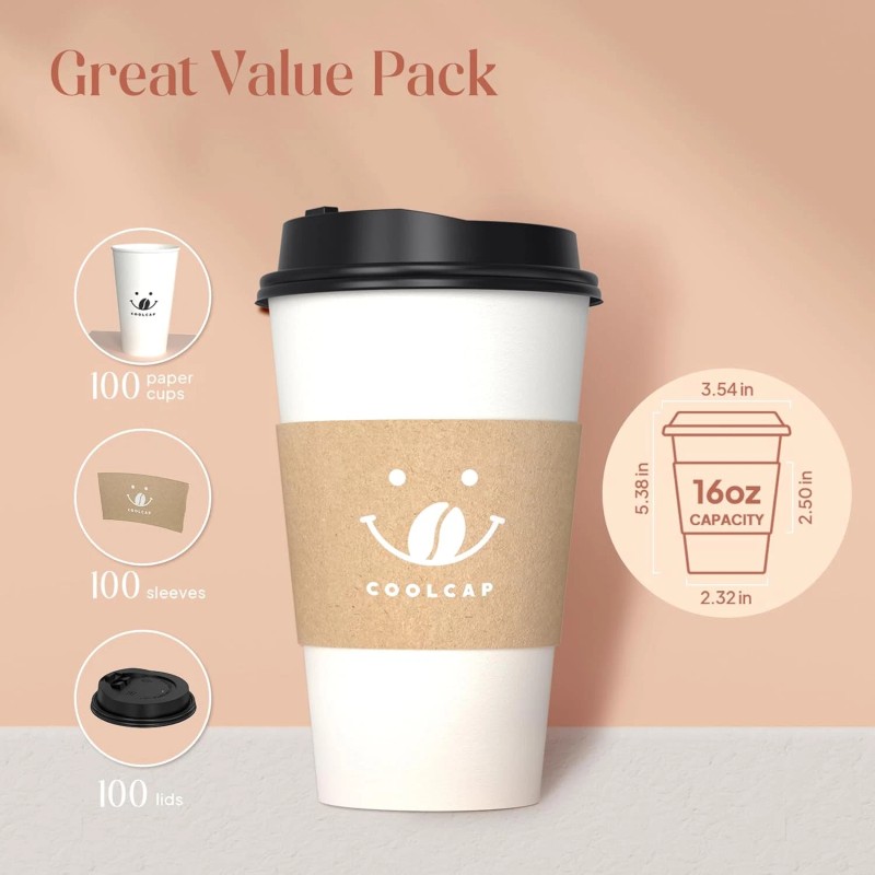 Bulk 16oz Coffee Cups with Lids & Sleeves - 100 Pack for Hot Beverages
