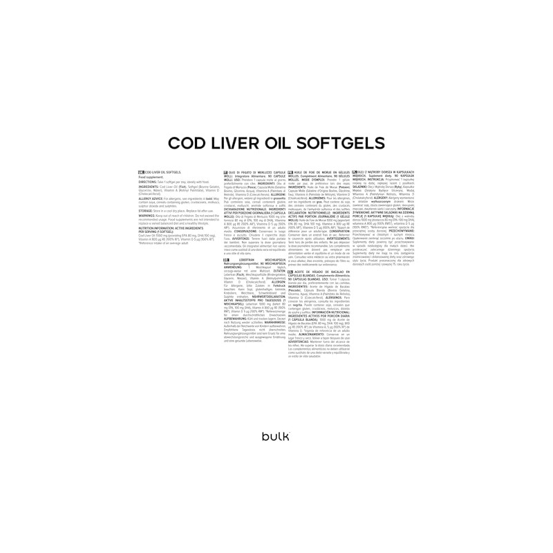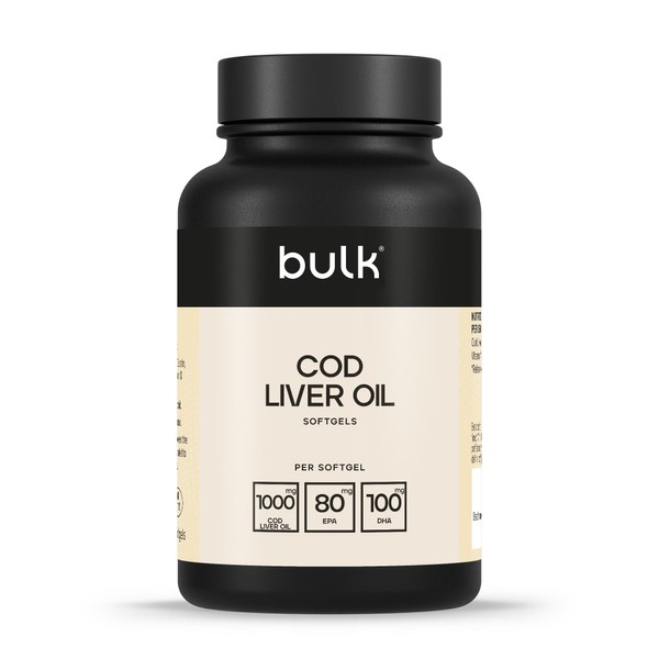 IngredientsCod Liver Oil (FISH), Softgel (Bovine Gelatin, Glycerine, Water), Vitamin A (Retinyl Palmitate), Vitamin D (Cholecalciferol).for allergens, see ingredients in CAPITALS.May contain soya, cereals containing gluten, crustaceans, molluscs, sulphur dioxide and sulphites.Product DescriptionPotently dosed cod liver oil supplements, providing 90mg of DHA and 80mg of EPA in a single softgel, plus vitamin A and vitamin D. Cod liver oil is a rich source of omega 3 fatty acids, one of the groups of essential fatty acids that can't be produced by your body, and therefore must be obtained through your diet or nutritional supplements.DirectionsTake 1 softgel per day, ideally with food.Safety WarningFood supplements are not intended to replace a varied and balanced diet. Do not exceed the recommended usage. Keep out of reach of children.Manufacturer Contact InformationBulk, 1 Gunfleet, Colchester, CO4 9QX, UK / Bulk, Centrum Logistyczne, ??kowa, 23, 55-095, Mirkw, Poland