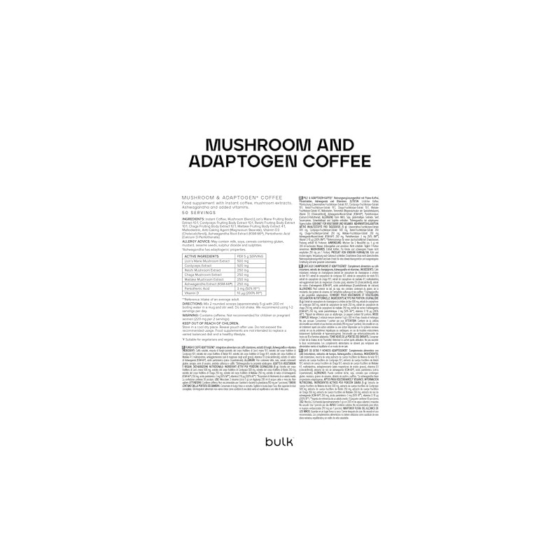 Product DescriptionSupport concentration, calm and cognition. Promote calmness1, stay focussed2 and aid mental performance3 with every sip of our Mushroom and Adaptogen? Coffee. It's powered by ashwagandha to provide relaxation and promote wellbeing1. Pantothenic acid combats fatigue? and Vitamin D supports immunity? to maintain optimal health. This blend is completed by lion's mane, cordyceps, reishi, chaga, maitake and coffee. Have a cup in the morning to stay sharp throughout the day. Why should I take it? BOOST FOCUS C Ashwagandha supports concentration2SUPPORT IMMUNITY C Vitamin D maintains a healthy immune system?16 G OF MUSHROOM PER CUP - including 5g Lion's Mane equivalentFUEL YOUR MIND C Pantothenic acid supports mental performance3 When should I use it?We recommend having a cup in the morning to feel the full benefits during the day.1Withania somnifera helps to support relaxation, mental and physical wellbeing, contributing to emotional balance and general wellbeing. 2Withania somnifera helps to maintain physical and mental capacities in cases of weakness, exhaustion, tiredness, and loss of concentration.3Pantothenic Acid contributes to normal mental performance.?Ashwagandha has adaptogenic properties.?Pantothenic acid contributes to the reduction of tiredness and fatigue.?Vitamin D contributes to the normal function of the immune system.IngredientsInstant Coffee, Mushroom Blend (Lion's Mane Fruiting Body Extract 10:1, Cordyceps Fruiting Body Extract 10:1, Reishi Fruiting Body Extract 10:1, Chaga Fruiting Body Extract 10:1, Maitake Fruiting Body Extract 4:1, Maltodextrin, Anti-Caking Agent (Magnesium Stearate), Vitamin D3 (Cholecalciferol)), Ashwagandha Root Extract (KSM-66), Pantothenic Acid (Calcium D-Pantothenate). May contain milk, soya, cereals containing gluten, mustard, sesame seeds, sulphur dioxide and sulphites.Manufacturer Contact InformationBulk, 1 Gunfleet, Colchester, CO4 9QX, UK / Bulk, Centrum Logistyczne, ??kowa, 23, 55-095, Mirkw, Poland