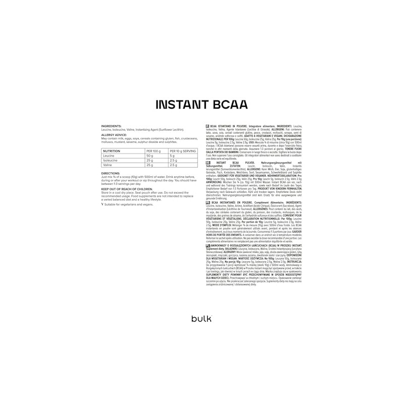 Product DescriptionGreat tasting, easy mixing branched chain amino acid powder, available in a range of delicious, refreshing flavours, providing a 2:1:1 ratio of leucine, isoleucine and valine BCAAs.Bulk formula uses the highest quality ingredients and is instantised for easy mixing, making it the perfect BCAA supplement if you need a steady supply of amino acids throughout the day.IngredientsLeucine, Isoleucine, Valine, Instantising Agent (Sunflower Lecithin).May contain milk, eggs, soya, cereals containing gluten, fish, crustaceans, molluscs, mustard, sesame, sulphur dioxide and sulphitesDirectionsMix 3/4 (three quarters) of a scoop (10 g) with 500 ml cold water. Instant BCAA is most commonly used before, during and after your workout or sipped throughout the day. Use 1 - 3 servings per day.Safety WarningFood supplements are not intended to replace a varied and balanced diet. Do not exceed the recommended usage. Keep out of reach of children.Manufacturer Contact InformationBulk, 1 Gunfleet, Colchester, CO4 9QX, UK / Bulk, Centrum Logistyczne, ??kowa, 23, 55-095, Mirkw, Poland.