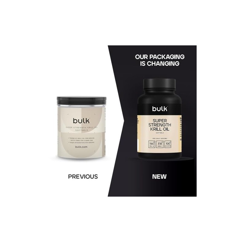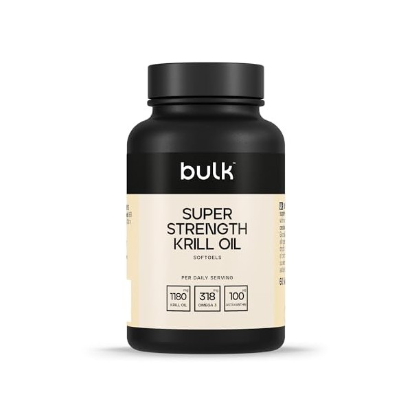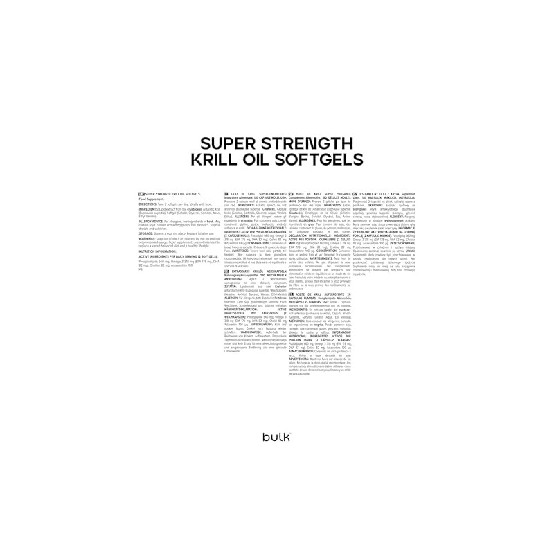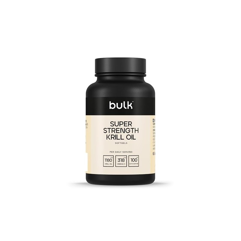 Product DescriptionBulk Super Strength Krill Oil is an incredibly potent source of Omega 3 Fatty Acids, with considerably higher amounts of EPA and DHA than equivalent quantities of our regular Krill Oil Softgels. If you're looking for a potently dosed krill oil then our Super Strength Krill Oil softgels would be the choice for you.Krill are small ocean-dwelling, shrimp like crustaceans. They typically live in the Antarctic waters of the Southern Ocean. Krill are herbivorous and are at the bottom of the food chain, meaning that they are naturally free from contaminants such as heavy metals. Super Strength Krill Oil Provides a total of 315mg Omega 3 Fatty Acids per 2 softgel serving, of which 178mg is EPA & 82mg is DHA.The Krill used in our Super Strength Krill Oil is known as the Euphausia Superba, a sustainable Antarctic species. They are a fantastic source of Omega 3 Fatty Acids and naturally deep red in colour due to the Astaxanthin they contain. Astaxanthin is a carotenoid which must be consumed in the diet as the body is unable to synthesise this on its own, this prevents damage to the oil and is believed to have antioxidant properties when consumed. Each of Bulk Super Strength Krill Oil softgels contain 100g Astaxanthin per serving.Where Krill Oil really differs from regular Omega 3 Fish Oils is due to the presence of phospholipids. Whereas the omega fatty acids in regular fish oils are supplied in a triglyceride format, Krill Oil almost exclusively supplies the beneficial fatty acids in a phospholipid format. Our Super Strength Krill Oil softgels also supply 566mg Phosphatidylcholine and 82.5mg Choline, meaning that they contribute to normal lipid metabolism, normal homocysteine metabolism and the maintenance of normal liver function.IngredientsPer softgel: Lipid extract from the CRUSTACEAN Antarctic Krill (Euphausia superba) 590mg, Softgel (Gelatin, Glycerol, Sorbitol, Water, Ethyl Vanillin).ALLERGENS: For allergens, see ingredients in CAPITALS.DirectionsTake 2 softgels per day, ideally with food.Safety WarningFood supplements are not intended to replace a varied and balanced diet. Do not exceed the recommended usage. Keep out of reach of children.Manufacturer Contact InformationBulk, 1 Gunfleet, Colchester, CO4 9QX, UK / Bulk, Centrum Logistyczne, ??kowa, 23, 55-095, Mirkw, Poland.