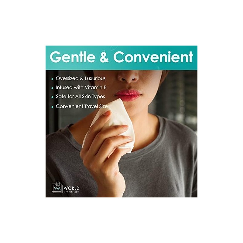 Introducing World Amenities Makeup Remover Wipes, the perfect addition to enhance your guests' stay. Whether it's hotels, Airbnb rentals, VRBO accommodations, day spas, guest rooms, motels, wedding receptions, or makeup artists' studios, these wipes provide the small added detail that increases guest satisfaction. Our gentle cleansing Makeup Remover Wipes are specifically formulated to dissolve all traces of makeup while being kind to the skin. Alcohol-free and non-abrasive, they effectively lift makeup, dirt, and impurities, leaving the skin feeling fresh and clean. Your guests can enjoy a gentle and thorough cleansing experience, suitable for all skin types. At World Amenities, we are committed to ethical practices. Our ingredients are ethically sourced, and our products have never been tested on animals. You can provide your guests with a guilt-free and cruelty-free experience, knowing that our Makeup Remover Wipes meet high ethical standards. Indulge your guests with oversized and luxurious wipes. Each wipe is super-saturated with protective vitamin E, providing a nourishing and refreshing cleanse. The sleek packaging ensures that the wipes remain fresh and ready for use, anytime and anywhere. Whether it's a quick touch-up during the day or a thorough cleanse before bed, these wipes are a convenient solution for guests on the go. Designed with hygiene and travel in mind, our Makeup Remover Wipes are individually wrapped for optimal hygiene. Each wipe is securely packaged, guaranteeing freshness and cleanliness for every use. They are also conveniently sized for travel, meeting flight safety requirements while still being large enough to effectively remove an entire face of makeup. Ideal for various hospitality industries, including Airbnb, VRBO, and hotels, these wipes provide a hassle-free and hygienic solution for guests. Elevate your guests' experience with World Amenities' Bulk Makeup Remover Wipes. Enhance their stay with convenience and luxury!