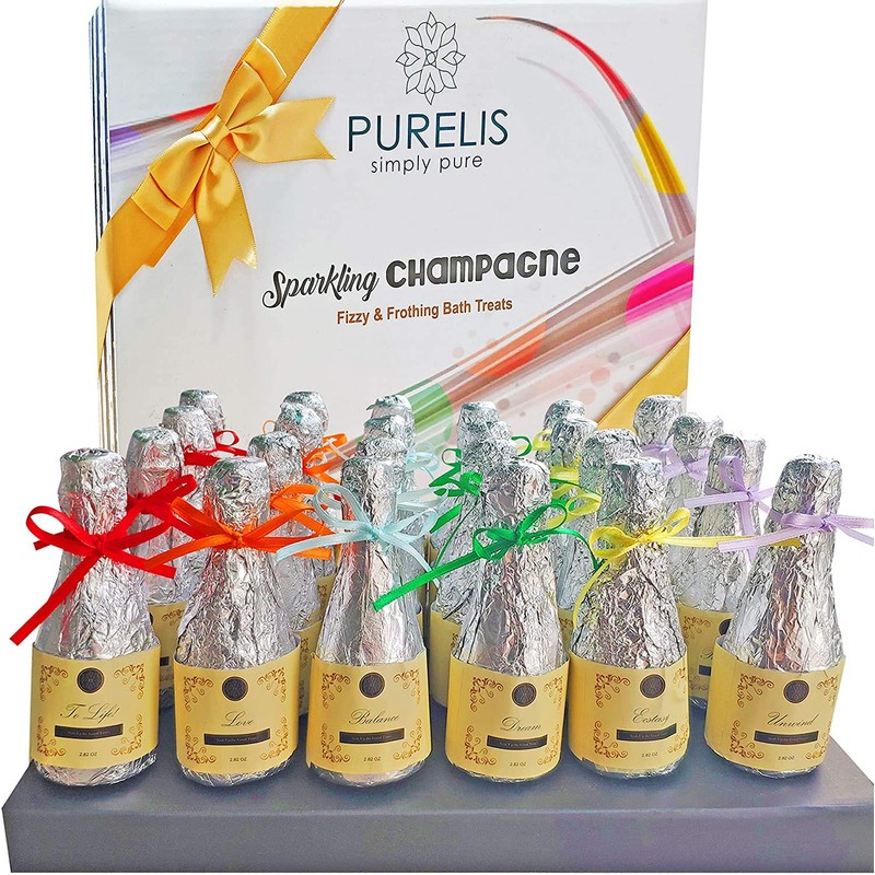 - BULK PARTY FAVORS BATH BOMBS SET 🍾 Our gift set contains 24 different natural bath fizzies in sparkling wine bottles to create 24 unique sensorial experiences . Purelis bulk party favors include a variety of magnificent fragrances! Each Nourishing Bath Bomb will exceed your expectations in terms of smooth silky skin, aromatherapy benefits and long-lasting beautiful fizz!