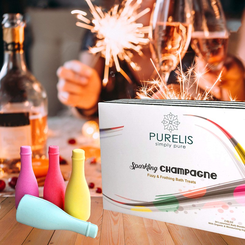 - CHAMPAGNE BATH BOMBS- SUPERIOR QUALITY 🍾 Purelis natural bath bombs are handmade using 100% pure, natural ingredients and essential oils, these bath bombs are nature’s garden to your bath. They’re vegan, gluten free and contain no toxic ingredients to deliver a magical bath experience with real health benefits for your skin.