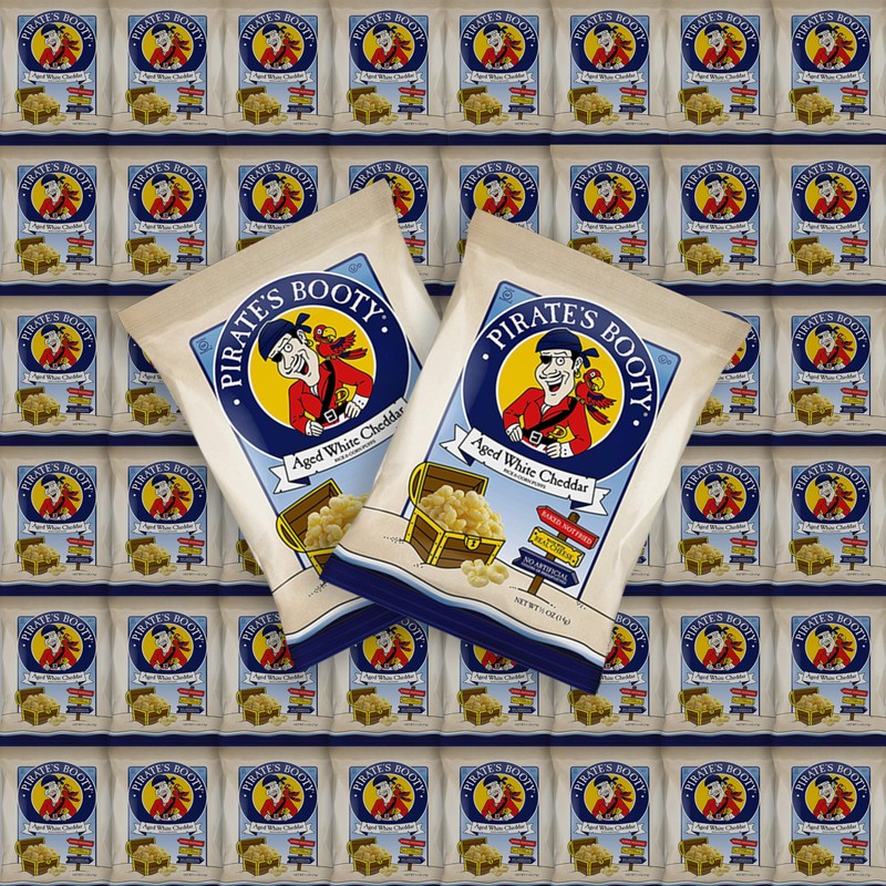 - Pirates Booty Aged White Cheddar Rice and Corn Puffs Chips: Includes 50 individual snack-sized bags by Bussin Boxes. Ships in the classic Bussin Box!