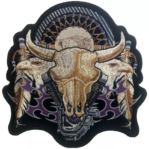 BULL WITH 2 EAGLES AND FEATHERS V-TWIN IRON ON BIKER PATCH 10 INCH PATCH