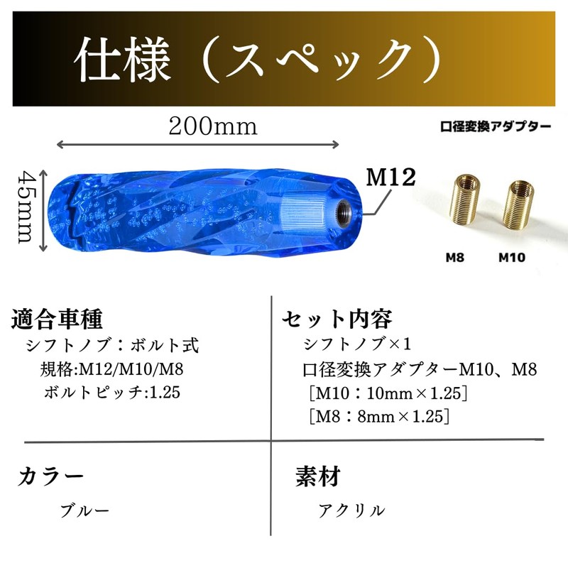 - Product Specifications: Total Length: Approx. 7.9 inches (200 mm) (7.9 inches (20 cm)) / Diameter: Approx. 1.8 inches (45 mm) / Weight: Approx. 13.8 oz (380 g) / Accessories: Includes M8 / M10 conversion adapter (compatible with a wide range of vehicles)