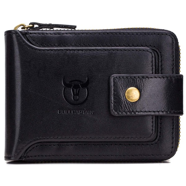 BULLCAPTAIN Men Zipper Around Wallet Genuine Leather RFID Blocking Bifold Large Capacity Coin Purse with ID Window (Black)