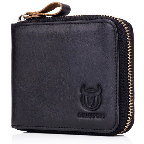 BULLCAPTAIN Mens Genuine Leather Zipper Wallet RFID Blocking Bifold Secure Zip Around Wallets Multi Credit Card Holder Purse (black)