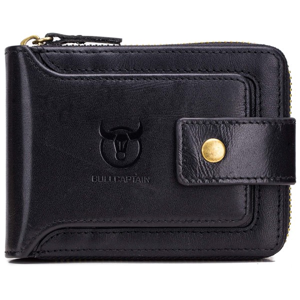 BULLCAPTAIN Mens Genuine Leather Zipper Wallet RFID Blocking Bifold Zip Around Multi Credit Card Holder (Black)