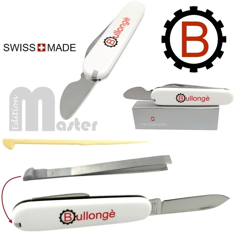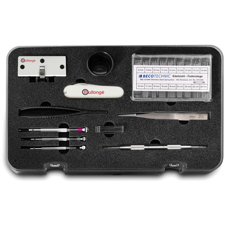 - Beco Technic Magnum Pro watchmaker repair tool set consisting of: BULLONGÈ case opener for screwed watch bases, Swiss case knife Master (with tweezers and oil pin) for pressed watch covers, plastic tweezers for watch batteries, 1.0, 1.2 and 1.6 mm watchmaker's screwdriver with replacement blades, large selection of stainless steel spring bars 8-24 mm total 360 pieces. antimagnetic stainless steel stainless steel Tweezers, BULLONGÈ 6767 spring bar tool including 1 mm fork and 0.8 mm mandrel, 2.5x watchmaker's magnifying glass / eye magnifier, plastic box with mould insert.