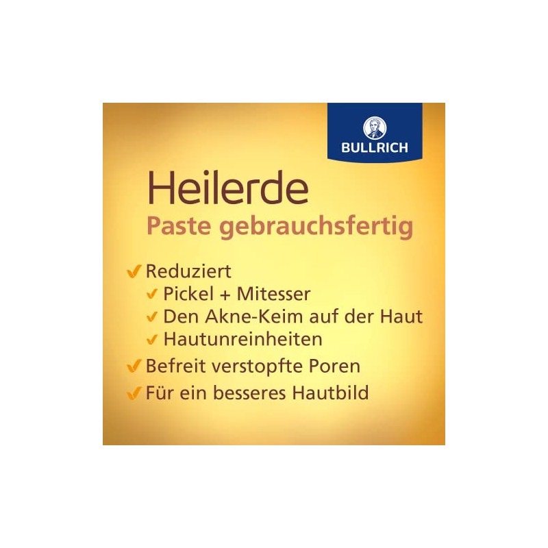 Bullrich Heilerde Paste gebrauchsfertig ist bereits fertig angemischt und erspart so das zeitaufwändige und umständliche Anrühren. Als Gesichtsmaske oder Peeling angewendet reinigt Bullrich Heilerde Paste die Haut sanft und porentief. Ihre besondere Oberflächenstruktur bindet Fette und Schadstoffe und hilft somit Pickel und Mitesser zu reduzieren. Bullrich Heilerde Paste sorgt für ein ebenmäßigeres und glatteres Hautbild, klärt und erfrischt die Haut.