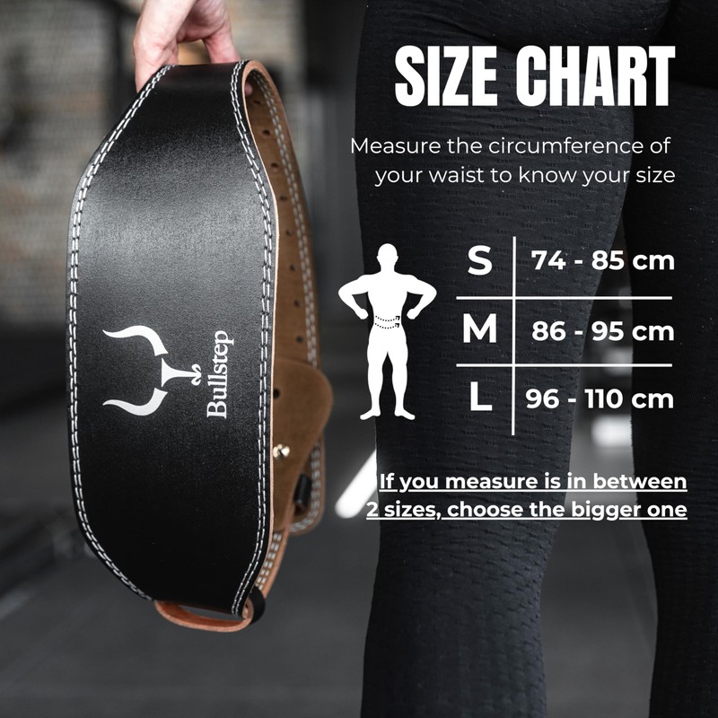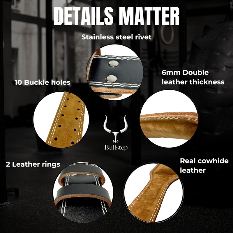 - ✅ QUALITY LEATHER: The Bullstep gym belt made of genuine cow leather is made for proper support to your back and provide the power needed for squat workouts, powerlifting, crossfit and bodybuilding. Two layers of leather ensure higher quality and durability.