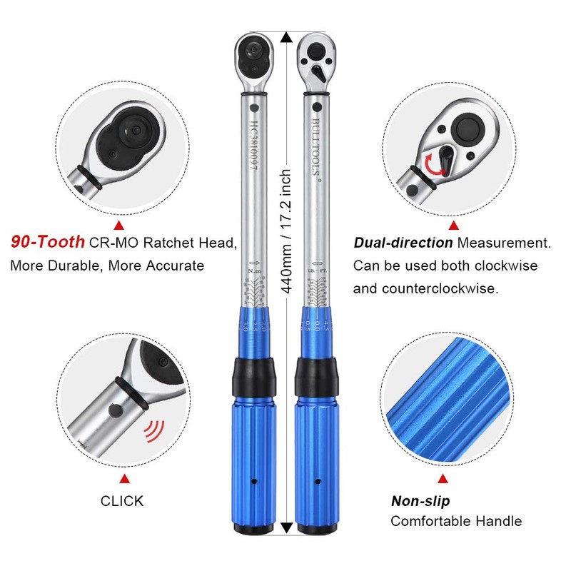 BULLTOOLS 3/8-inch Drive Dual-Direction Click Torque Wrench Set 90-tooth High Accuracy Torque Wrench with Buckle (10-100ft.lb/20-135Nm)