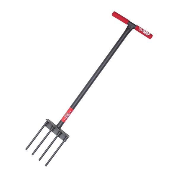 The Bully Tools 92463 All Steel Spading Fork with T-style Handle is the perfect tool for digging, turning and aerating soil in beds and gardens. Its four prongs are constructed from 100% Made In The USA steel, which is up to 30% more durable than foreign competitors, a handle made from high quality fiberglass and coated in a polyester veil to prevent splintering and increase strength, and it features a T-shaped grip designed to increase leverage and reduce hand fatigue, while wide enough to accommodate work gloves. The Bully Tools Spading Fork also comes with a limited lifetime warranty that protects against defects in material and workmanship.