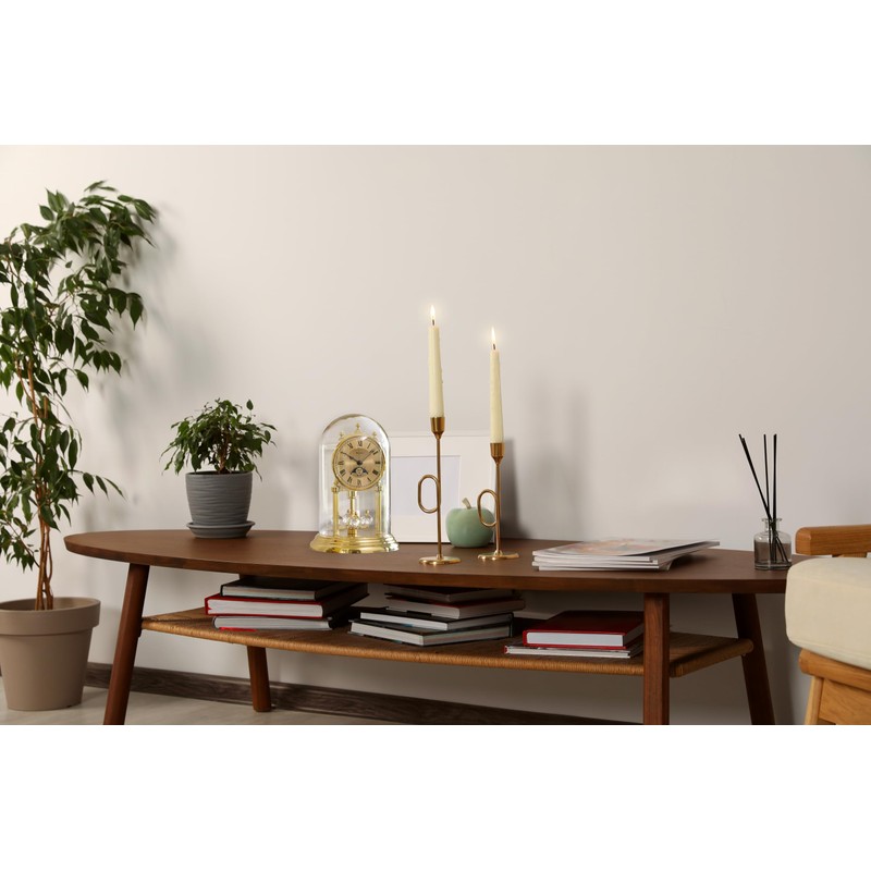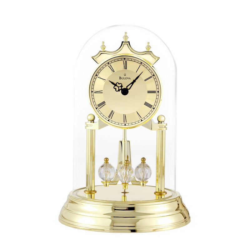 Bulova Tristan I Desk and Table Clock | Model B8818 | Polished Brass Finish | Polished Metal Base | Floating Dial | Roman Numerals | Elegant Pendulum Design