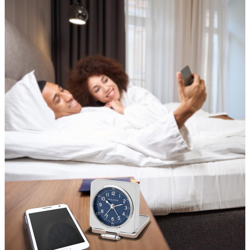 Bulova Travel Hack Alarm Clock B1882 | Vintage-Inspired Flip Cover Design with Blue Dial | Quartz Movement | Battery Included | Compact Travel Clock with Gift Pouch