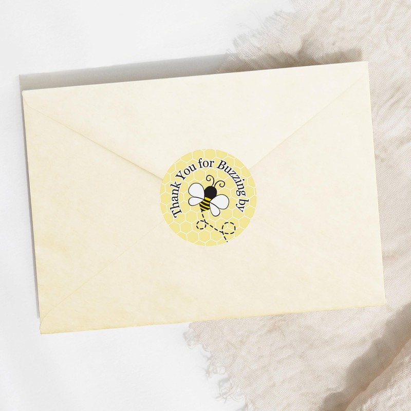 - 40 STICKERS: bumble bee Thank You For Buzzing By stickers made to match bee themed baby showers, gender reveal parties, and birthdays.